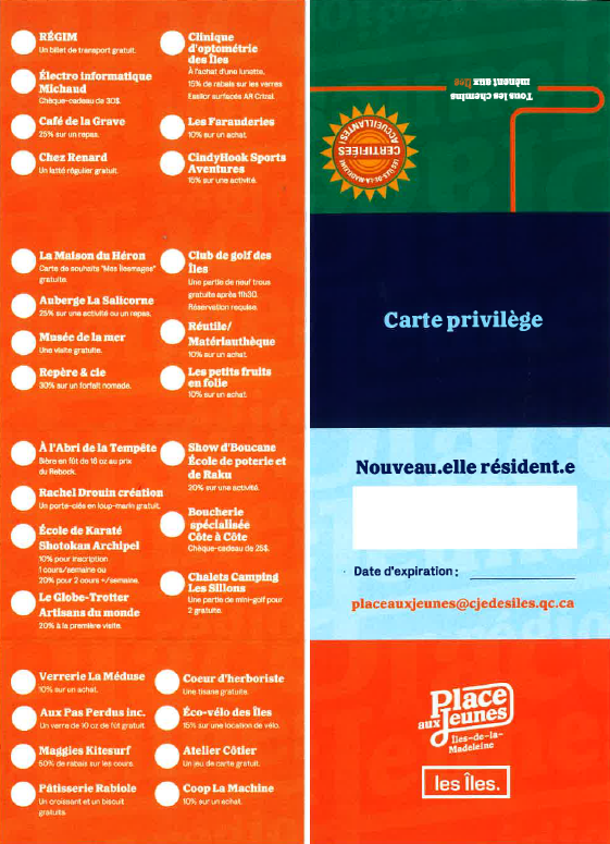 Tu es installé.e aux Îles depuis moins d’un an? Contacte l’agente Place aux jeunes pour recevoir ta carte privilège.